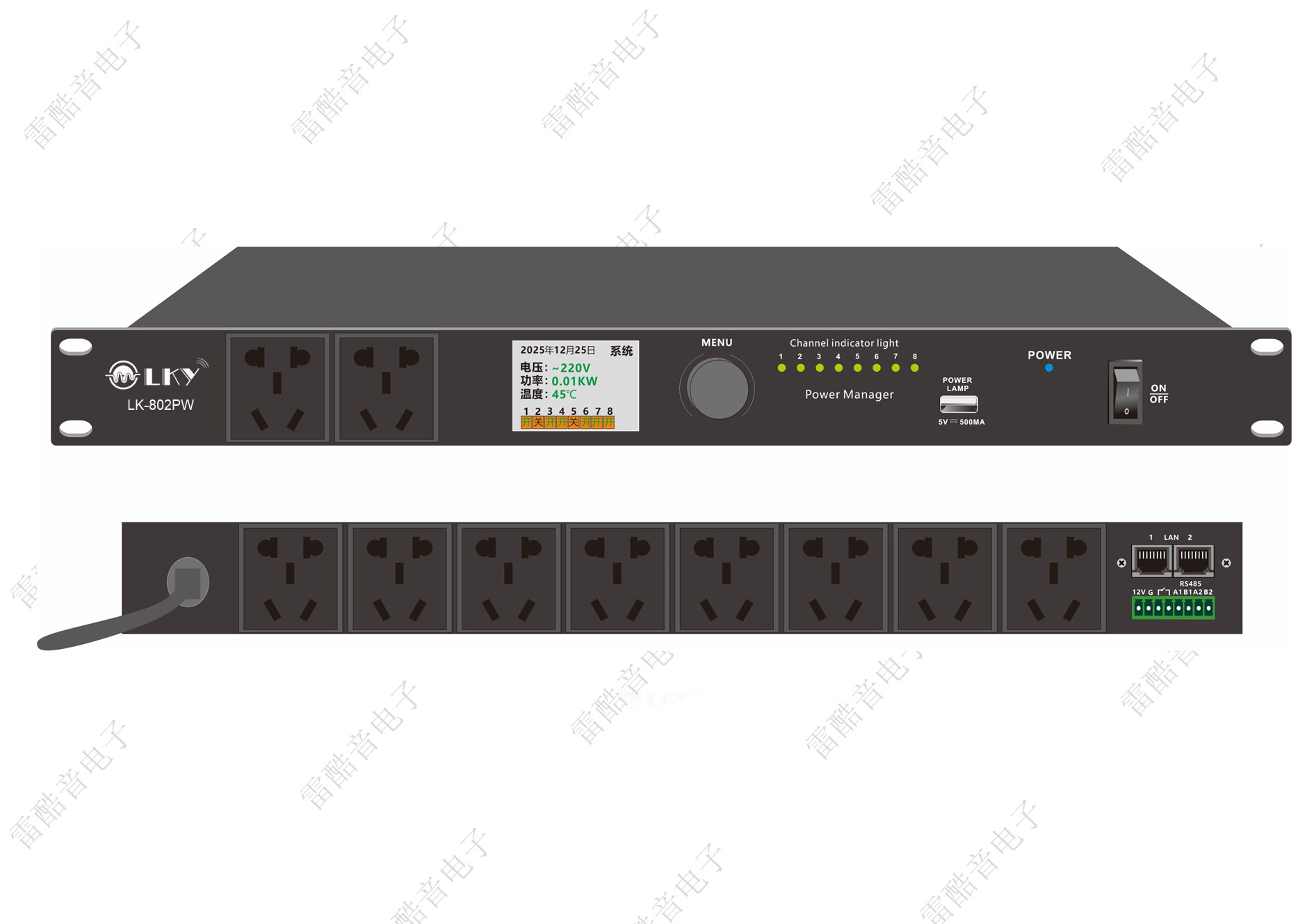 3.具备8路电源输出插座,其中8路10A的5孔插座规格,总电流达30A。前面板2路10A的5孔插座,支持实时监控插座功率。