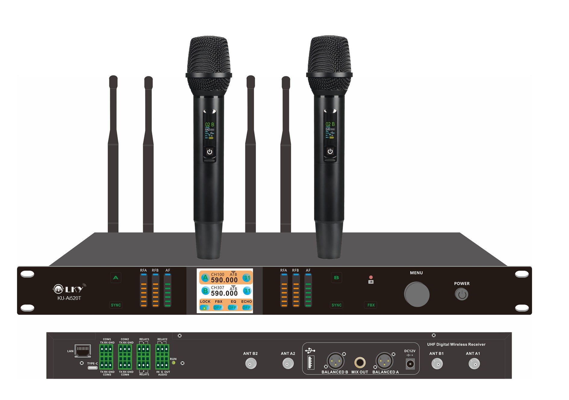 1.采用数字设计方案,为现场专业而演出设计,采用真分集四天线设计,内置天线分配系统,单通道AB智能接收,有效增强死点处理,实现远距离接收不断频;